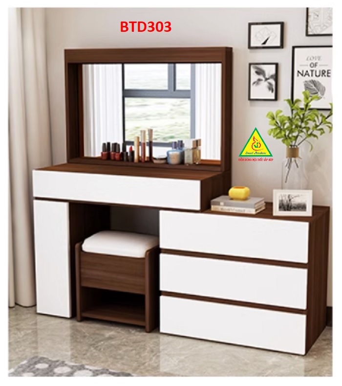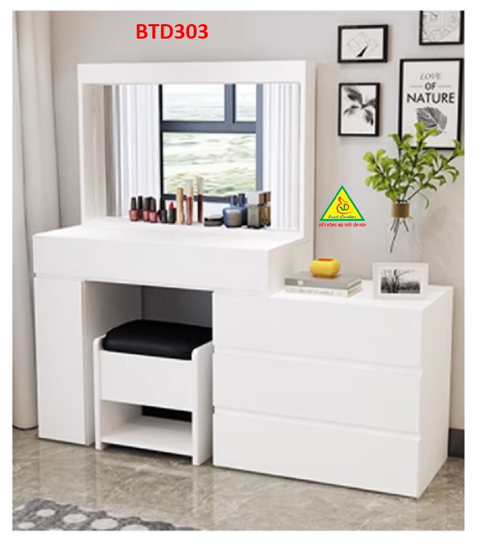 1.Một số thông tin về bàn trang điểm và một số loại bàn trang điểm phổ biến: Bàn trang điểm cơ bản: Đây là loại bàn trang điểm đơn giản, thường có một mặt phẳng để đặt gương và các dụng cụ trang điểm. Nó có thể có một hoặc hai hộc kéo để lưu trữ các sản phẩm trang điểm và phụ kiện. Bàn trang điểm cơ bản thường có thiết kế đơn giản và phù hợp với nhiều phong cách nội thất.