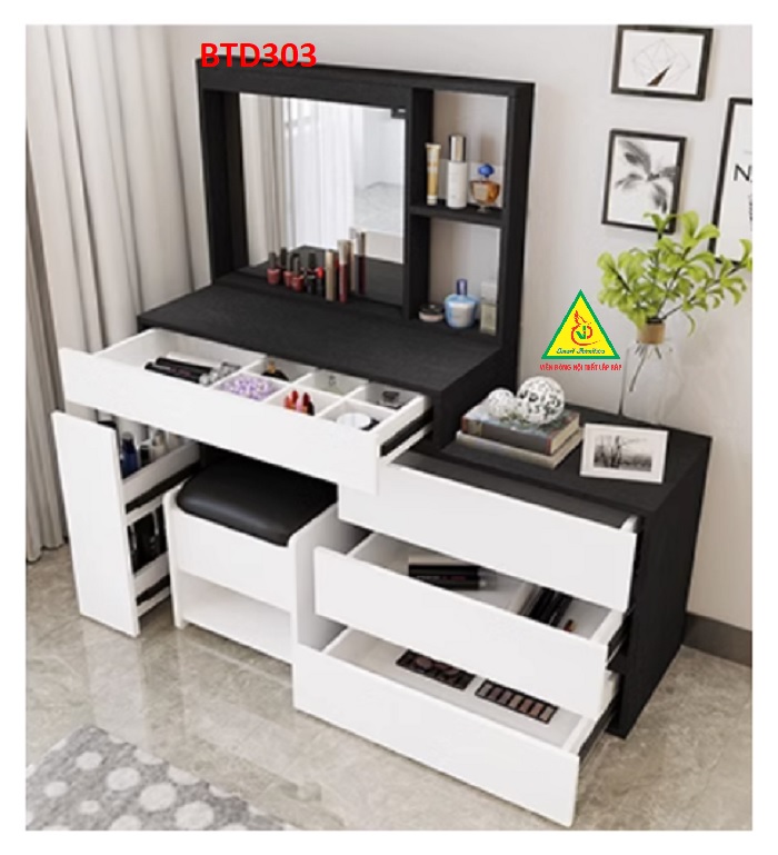 Bàn trang điểm là một món đồ nội thất quan trọng trong phòng ngủ hoặc phòng trang điểm, được sử dụng để tạo ra một không gian thuận tiện và thú vị để trang điểm và làm đẹp.