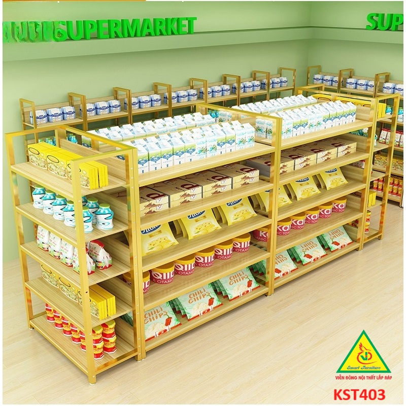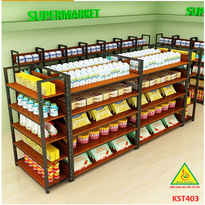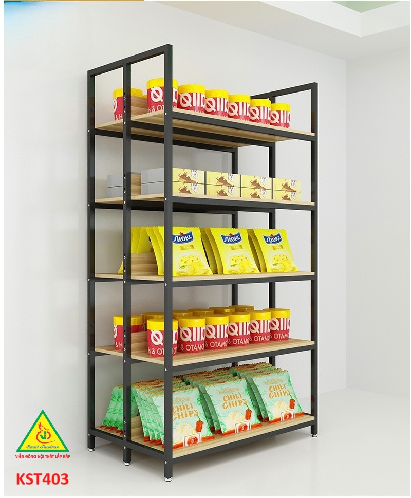 Kệ khung sắt mặt gỗ là một một loại kệ trưng bày hoặc để hàng hóa sản phẩm. Tuy nhiên, thay vì sử dụng mâm tole , thì các mẫu kệ này sẽ được sử dụng chất liệu gỗ MDF để làm mâm chứa hàng, kết hợp với khung sắt chắc chắn, thì mẫu kệ này là loại kệ để được rất nhiều loại đồ, và ứng dụng được trong rất nhiều nhu cầu của khách hàng như chứa đồ, trang trí, bán hàng…