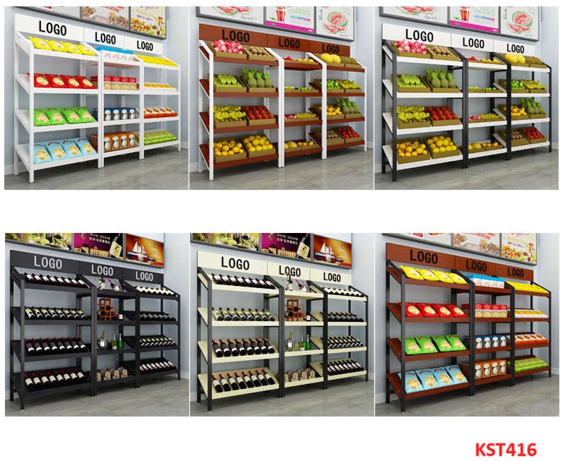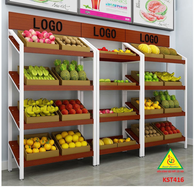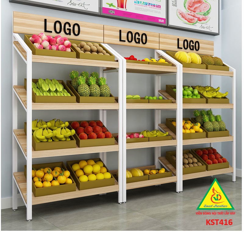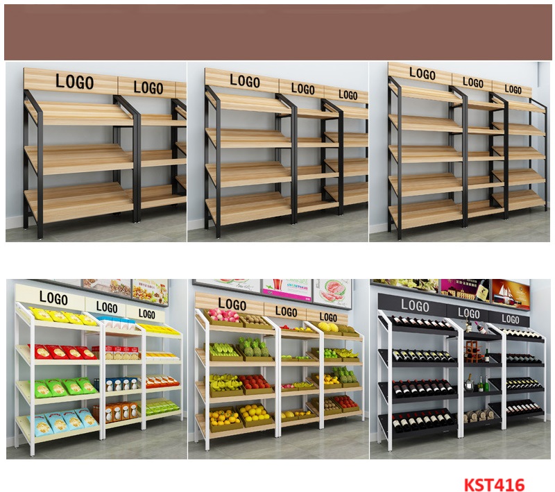 Kệ gỗ khung sắt trưng bày sản phẩm trong các cửa hàng trái cây, rau củ quả