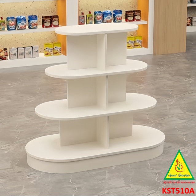 1. Thiết kế thông minh – tối đa công năng: Kệ có dạng oval bo tròn mềm mại, kết hợp với 4 tầng trưng bày rộng rãi, giúp sắp xếp sản phẩm gọn gàng, dễ quan sát và tạo cảm giác thẩm mỹ cao. Kiểu dáng đối xứng 2 mặt cho phép khách hàng dễ dàng tiếp cận sản phẩm từ cả hai phía, đặc biệt phù hợp đặt ở trung tâm không gian.
