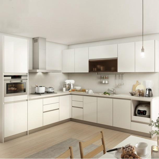Tủ bếp chữ L có thiết kế chạy dọc hai bức tường giúp tận dụng không gian góc, rất phù hợp với các căn hộ chung cư có diện tích nhỏ.