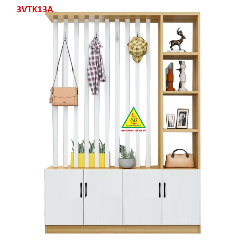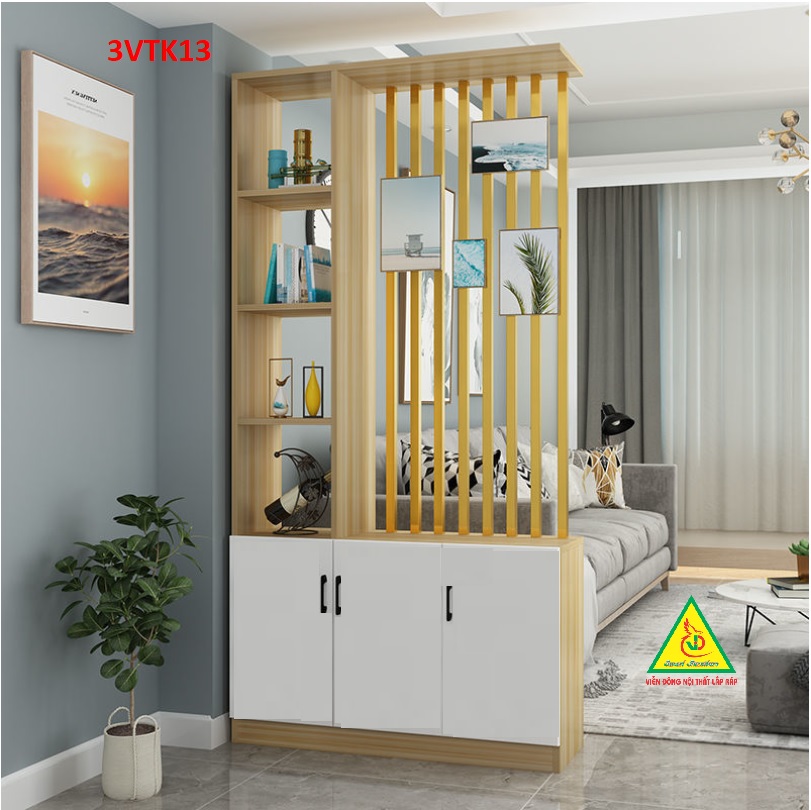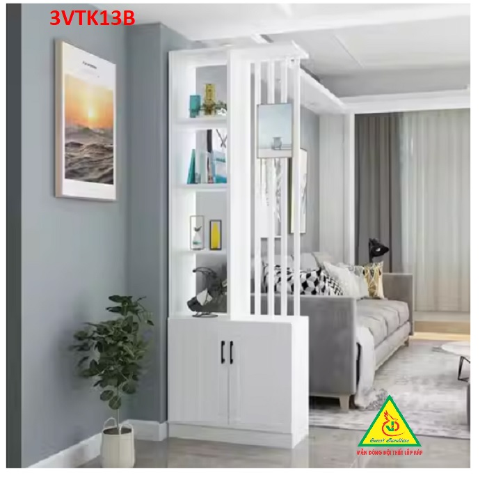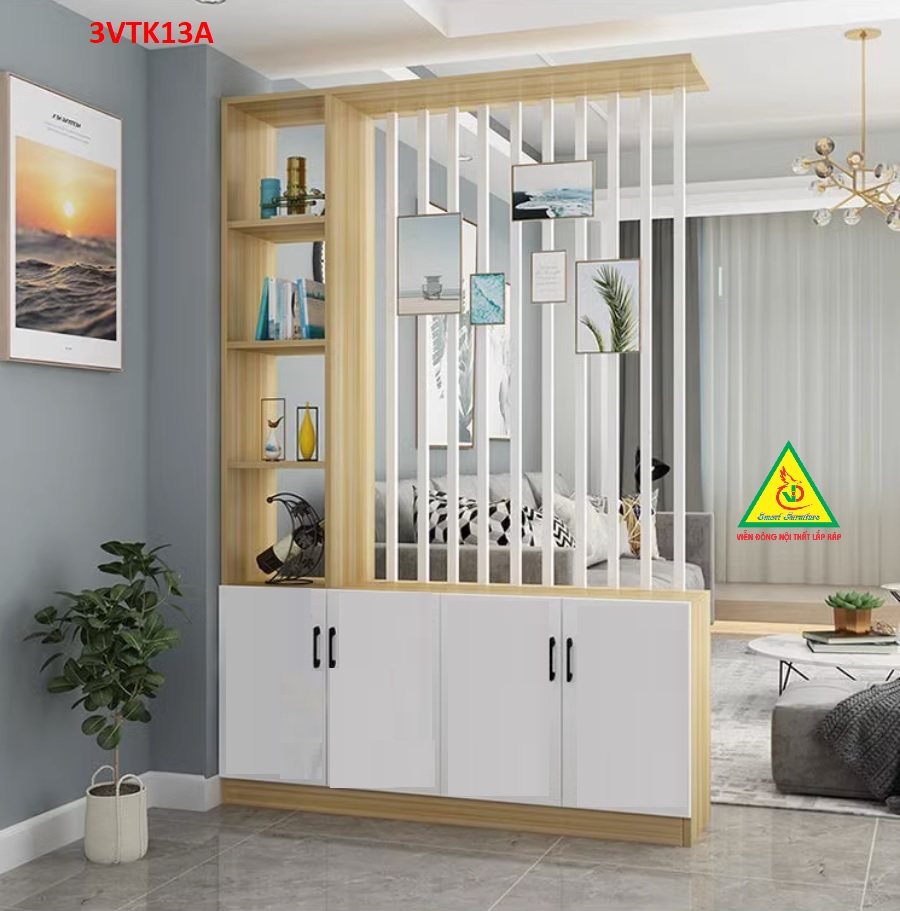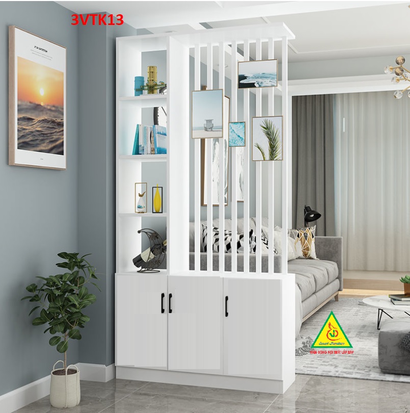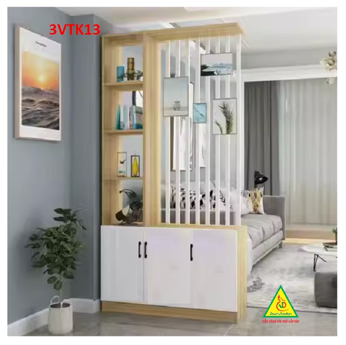Vách ngăn có thể có các kệ mở hoặc tủ kệ đóng, tùy thuộc vào mục đích sử dụng và thẩm mỹ của bạn. Các kệ có thể được sử dụng để trưng bày sách, đồ trang trí, hệ thống giải trí hoặc để lưu trữ các vật dụng khác trong phòng khách.